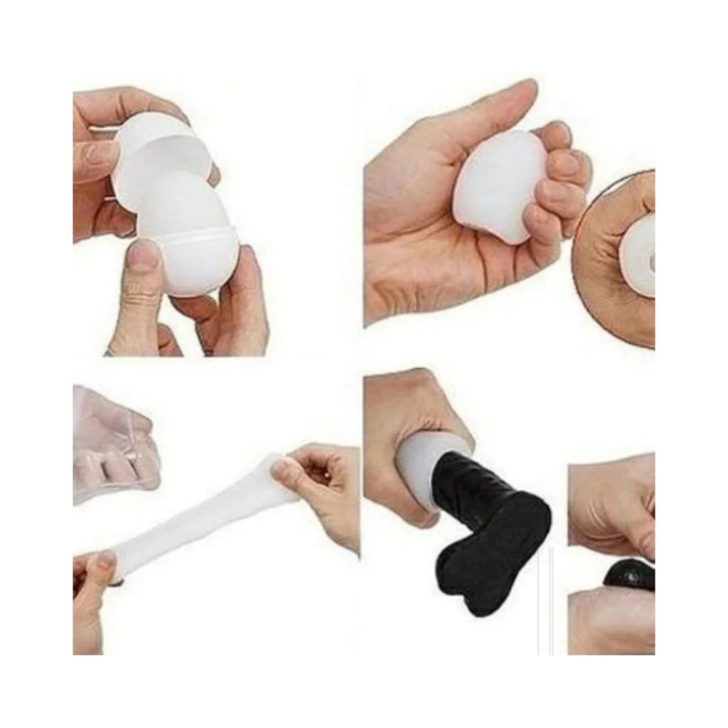 A embalagem imita uma casca de ovo, você encontra uma peça de silicone atóxico que imita um ovo, porém oca e com um orifício na base. Por dentro, diferentes padrões de texturas garantem um leque de sensações para a masturbação.